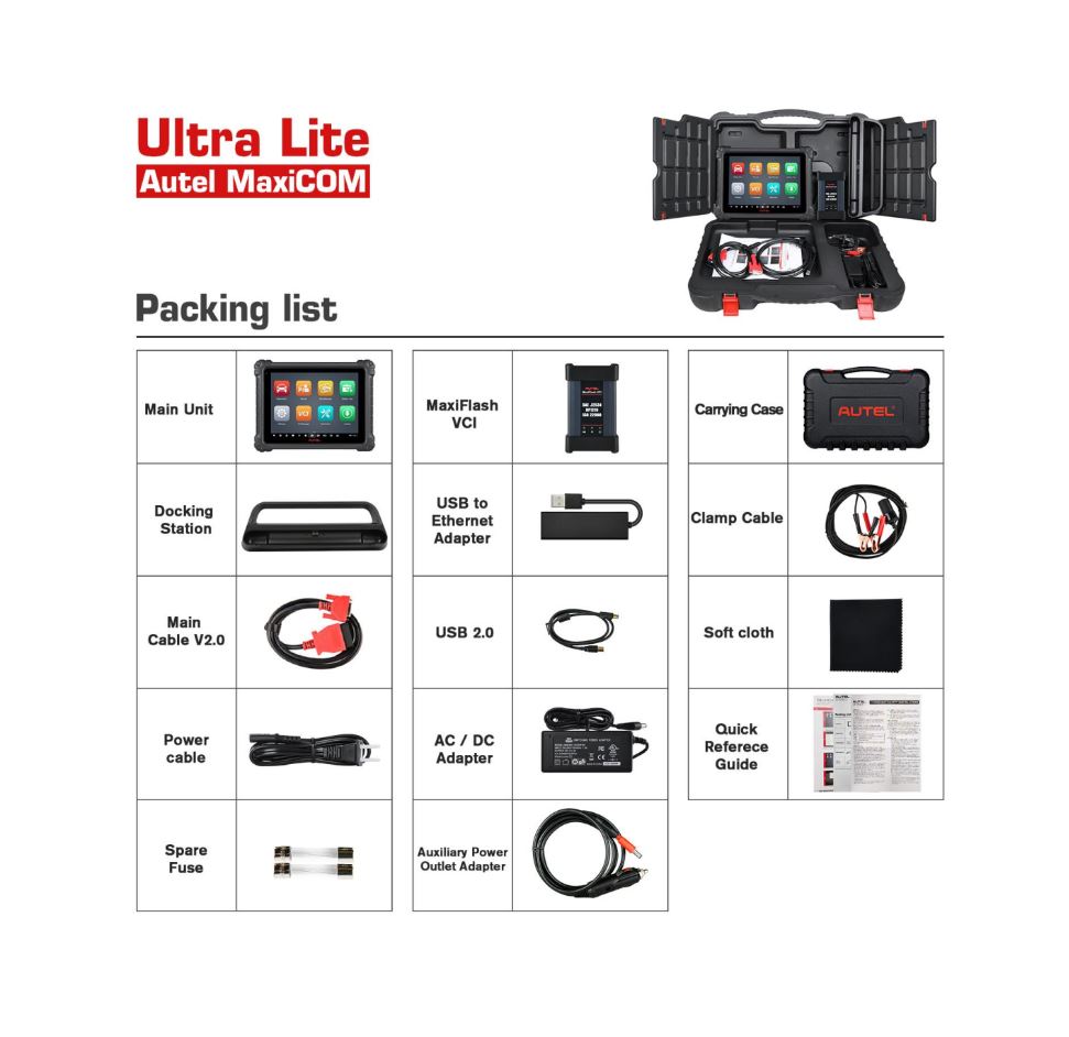 Autel MaxiCom Ultra Lite are aceleasi functii ca Autel MaxiSys Ultra doar ca nu contine cabluri adaptoare necesare masinilor de generatie veche.